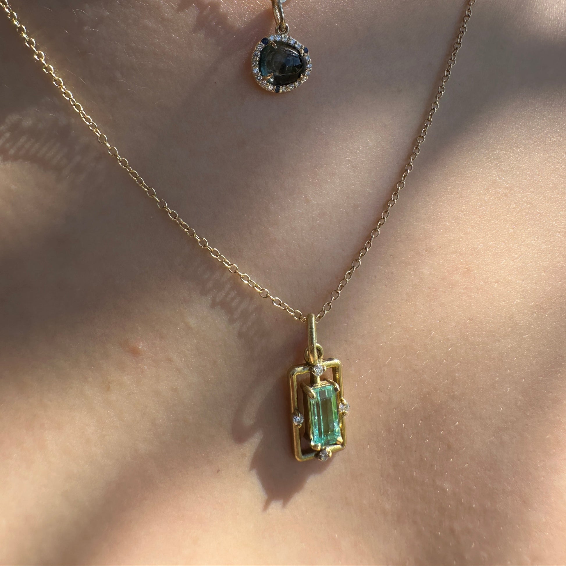 Crafted in 14 karat gold with a soft satin finish, this pendant features a natural tourmaline framed by delicate natural diamonds. The open Aura setting allows light to move through the stone, revealing its depth of color and quiet glow while keeping the gemstone at the center of the design.